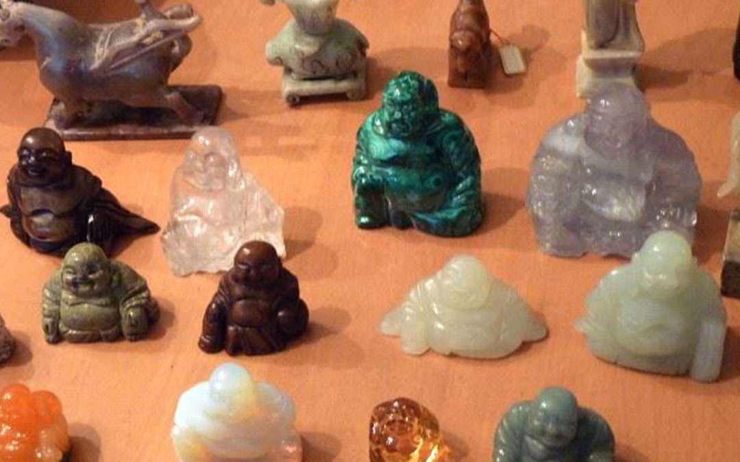 ~Buddha Collection in Semi-Precious Stones- of- malachite, fluorite, opaline, goldstone, amber resin, tiger’s eye, quartz, serpentine, corundum (non-gem quality ruby), amethyst, aventurine, lemon serpentine, dalmatian jasper, and nephrite.